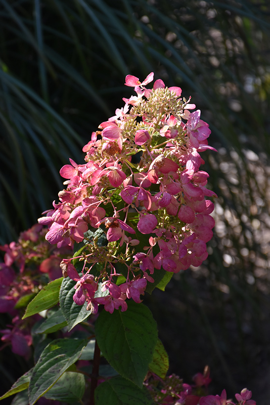 Diamond Rouge® Hydrangea features bold conical white flowers with pink overtones at the ends of the branches from early summer to late fall. The flowers are excellent for cutting. It has green deciduous foliage. The pointy leaves do not develop any appreciable fall color.