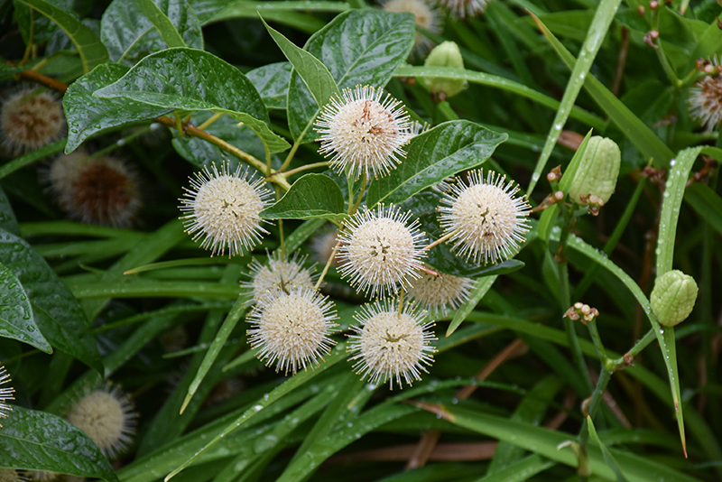 Button Bush features unusual creamy white ball-shaped flowers along the branches from early to late summer. It has green deciduous foliage. The pointy leaves do not develop any appreciable fall color.